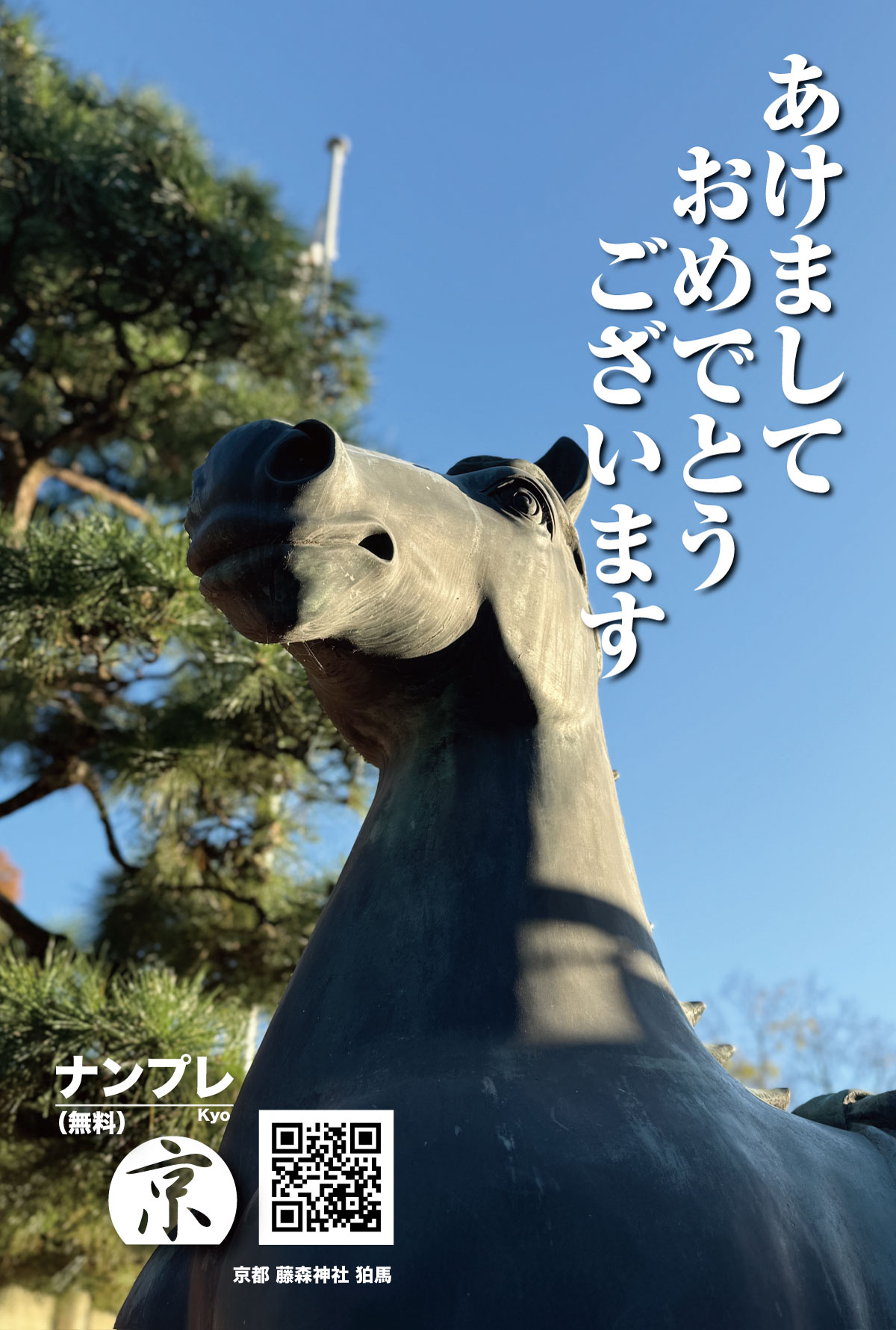 年賀状の素材です。京都 藤森神社に狛犬ならぬ狛馬がありまして、そこで写真を撮ってきました。ご自由にお使いください 画像を右クリックするとダウンロードできます。